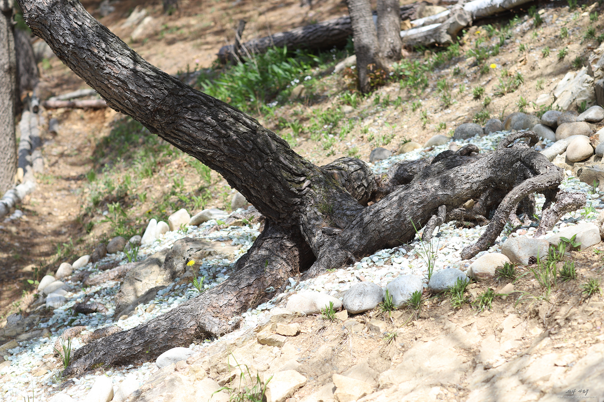 둥치만큼 크고 굵은 뿌리, 어림잡아 50전쯤 될까요. 세 갈래 뿌리는 1m 동서남북으로 깊숙이 박혀 있고, 그 형상은 마치 도약하려는 개구리의 뒷모습 같았습니다. 조금 떨어진 자리에서 바라보면, 두 무릎을 굽히고 엉덩이를 붙인 채 곧게 앉은 사람의 모습이 선명합니다. 사람 손으로도 만들기 어려운 이 형상을 자연은 조용히, 천천히 빚어낸 것이지요.